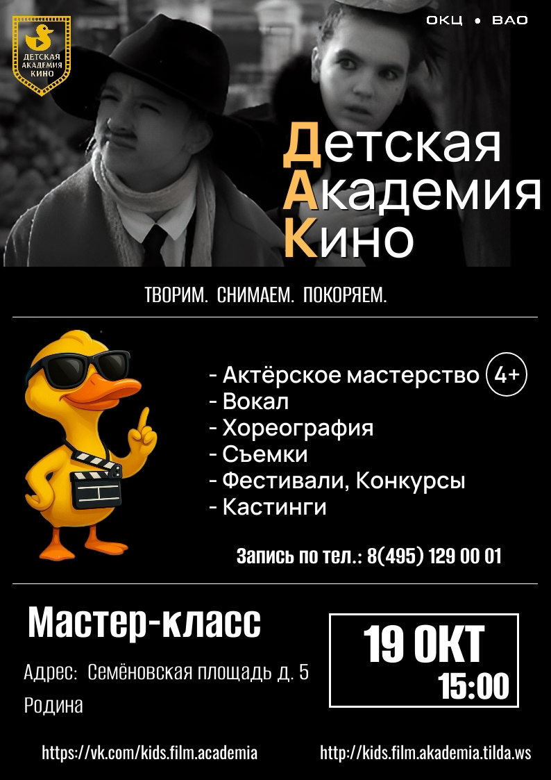ТУ ООЦ им. Моссовета приглашает на увлекательный мастер-классТУ ООЦ им. Моссовета приглашает на увлекательный мастер-класс, который состоится 19 октября в 15:00. Что вас ждёт: 🎥Профессиональные преподаватели 🎥Творческая атмосфера 🎥Новые знакомства 🎥Полезные навыки 🎯 Участие бесплатное! 📅Когда: 19 октября ⏰Время: 15:00 📍Место: Семеновская площадь д. 5 (Родина) Подробнее по телефону: 8(495)129-00-01 После мастер-класса, сможете подробнее узнать об Академии кино и задать вопросы. Не упустите возможность провести время с пользой и удовольствием! #Соколинаягора #ВАО #Творчество #Досуг #Мастер-класс #ООЦимМоссовета #Кино