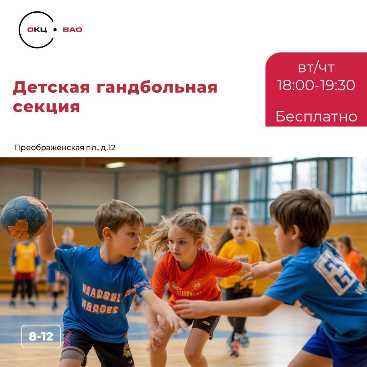 Территориальное управление \"Моссовет\" ГБУ г. Москвы \"Объединение культурных и досуговых центров ВАО\" приглашает детей и подростков на тренировки по гандболу!Территориальное управление "Моссовет" ГБУ г. Москвы "Объединение культурных и досуговых центров ВАО" приглашает детей и подростков на тренировки по гандболу! 🤾 Гандбол — это зрелищная и динамичная командная игра. Она отлично развивает: • Скорость и реакцию. • Ловкость и координацию. • Навыки командного взаимодействия. • Стратегическое мышление. ✅ Занятия проходят в современном, полностью оборудованном зале ТУ «Моссовет» ГБУ «ОКЦ ВАО». ✅ Профессиональное покрытие и качественный инвентарь. ✅ Опытные тренеры. Это больше, чем спорт — это адреналин, дружба и умение побеждать вместе! Важно: • Возраст: 8–12 лет. • Расписание: вторник/четверг, 18:00–19:30. • Стоимость: БЕСПЛАТНО. Как записаться? Заполните короткую форму по ссылке: https://forms.yandex.ru/u/6883906202848f0775109a07/ Не упустите шанс попробовать себя в одном из самых интересных видов спорта! #гандбол #спортдлядетей #ВАО #Москва #бесплатныезанятия #ОКЦВАО #детскийспорт #команднаяигра