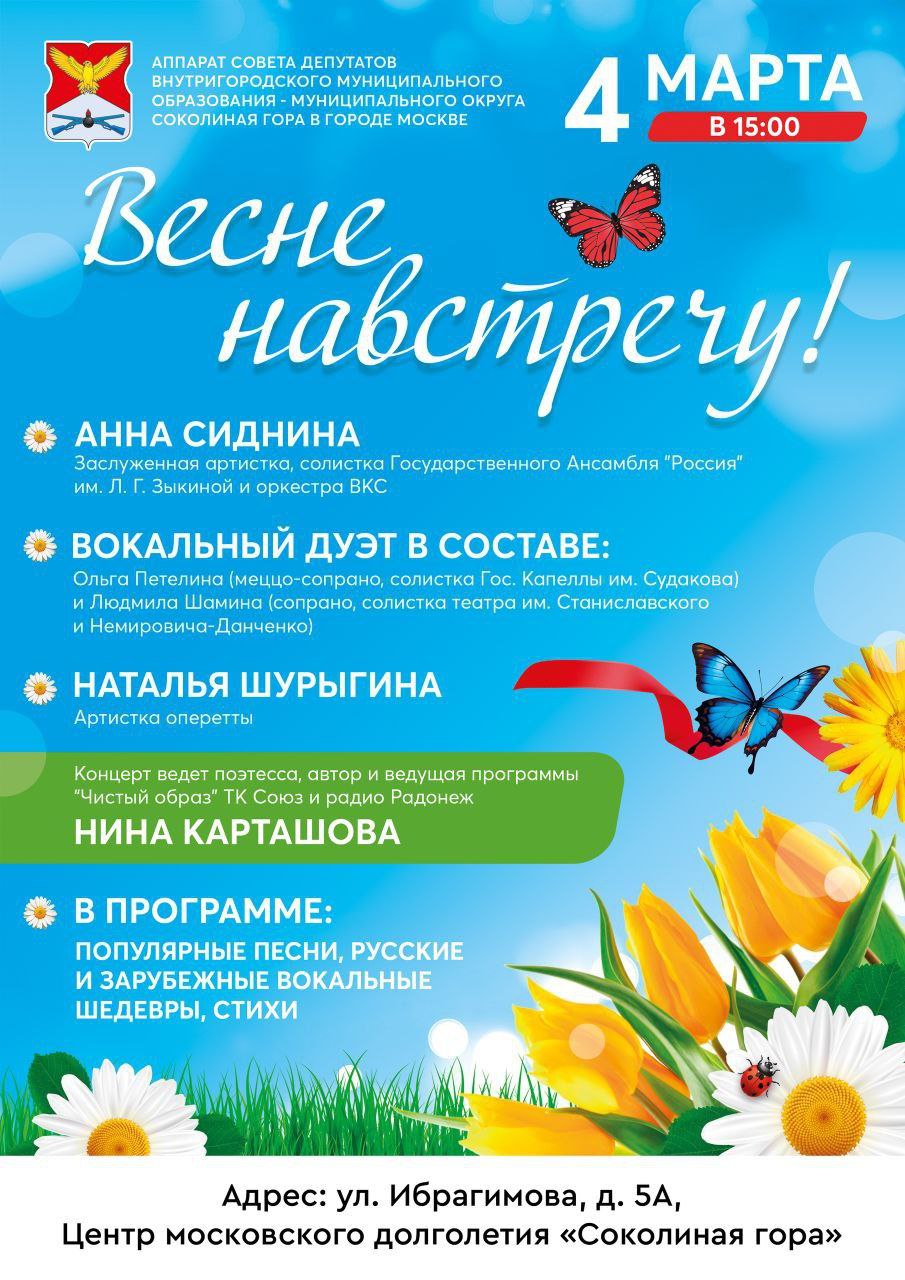 В муниципальном округе Соколиная гора в городе Москве 4 марта в 15.00 состоится праздничный концерт «Весне навстречу!», посвященный Международному женскому дню 8 марта. Приглашаем всех желающих! Вход свободный. 24.02.2026 |